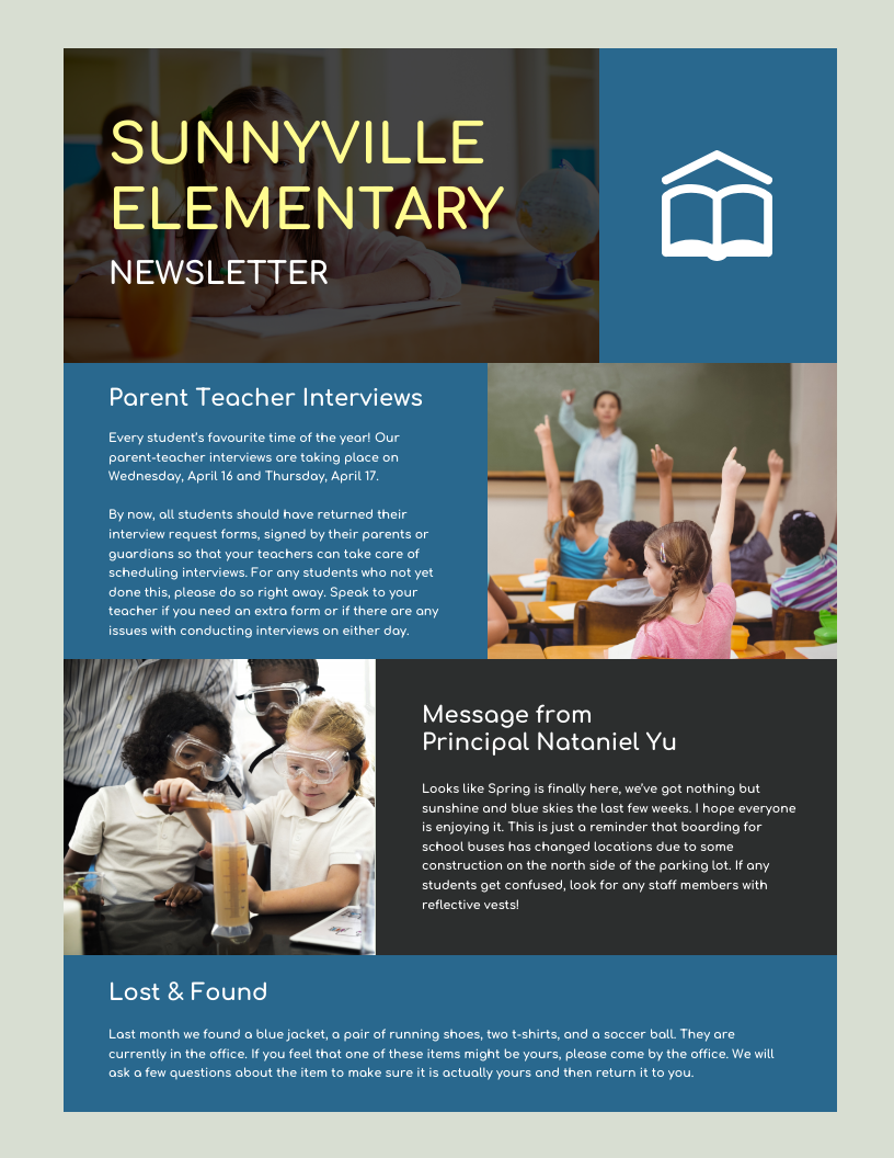 Compose a modern school newsletter and more by modifying this Blue and Gray Elementary Newsletter Template