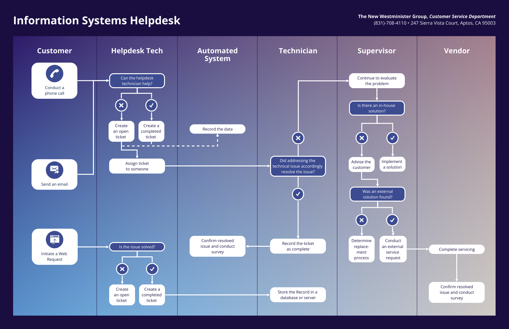 Customer Service Swimlane Chart is a process map that depicts the roles and defined responsibilities of an organization's customer service department. This type of chart shows how processes are carried out within a department, as well as the sequence in which tasks should be completed. It will allow workers in customer service to know what is expected of them and how their job functions are related to the entire department. Employees can work most effectively when they understand their role within an organization, along with how it functions as a whole. A Customer Service Swimlane Chart, therefore, allows employees to follow policies and procedures more carefully because they have a better understanding of how their job functions affect the entire department. Swimlane Chart can be easily created using Venngage’s free Customer Service Chart template. You don’t need to be a designer, have design experience, or download any design tools in order to customize this template. With just a few clicks of your mouse, you will be able to complete a Customer Service Swimlane Chart that looks very professional. You can also add text