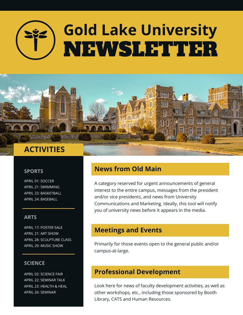 Compose a classy university newsletter and more by personalizing this Gold University Newsletter Template